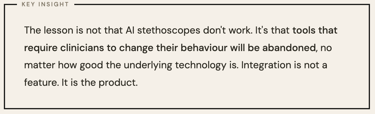 I want to be clear about what TRICORDER did not find. It did not find that AI stethoscopes are ineffective. It did not find that the algorithms were poor. It did not find that clinicians were hostile or patients resistant.