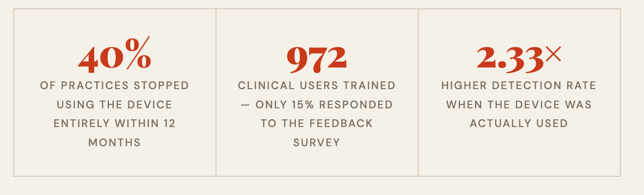 Let that sit for a moment. The AI worked. The clinicians were trained. The devices were free. The study ran for a full year. And still — at a population level — the needle barely moved.