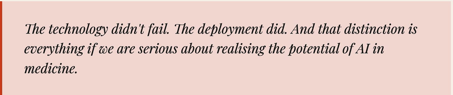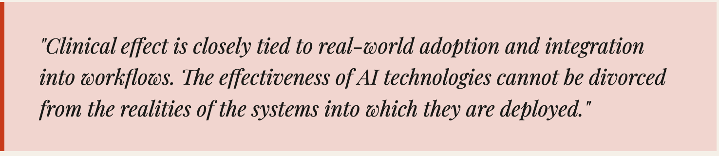 That is an implementation question. It is a behavioural question. It is an organisational design question. And it is a question the health AI field has been chronically under-resourced and underincentivised to answer.